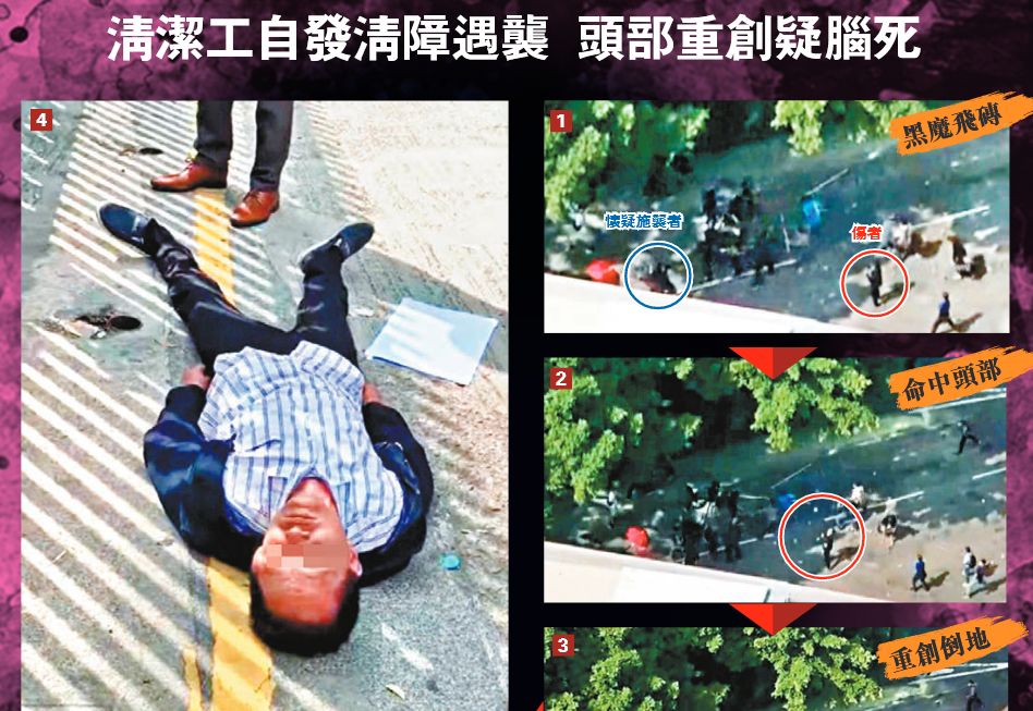 令人悲痛的是,一名70歲的清潔工疑被暴徒磚頭砸中,導致腦幹死亡: