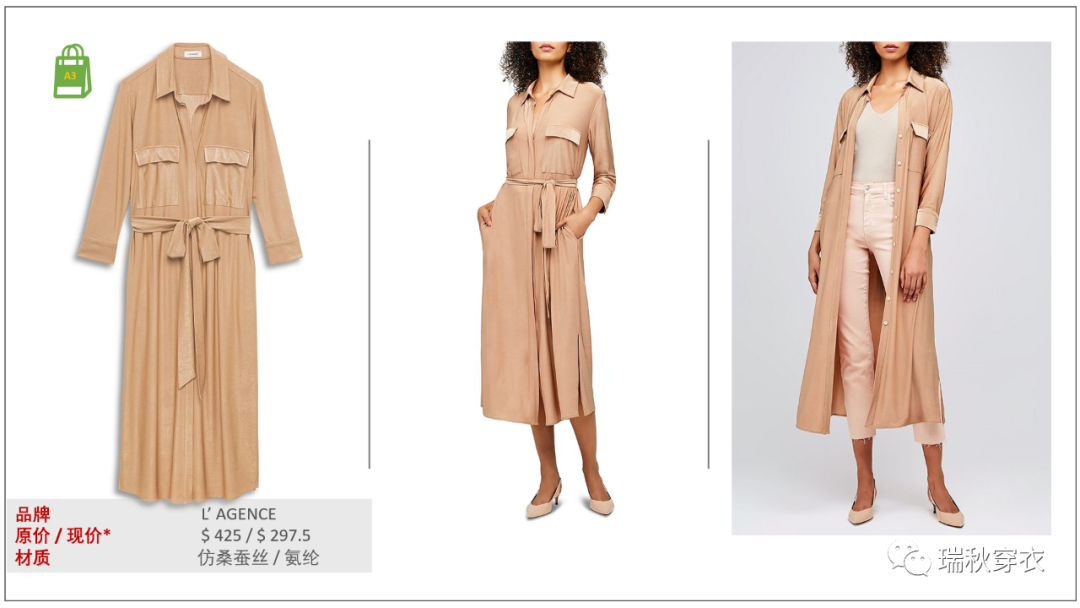 最後一條膚色長裙選自L'AGENCE,名字是法文,但品牌成立於洛杉磯,走高端路線,借地利之便,和好萊塢的明星互動很多。這條裙子當薄外套穿也行。