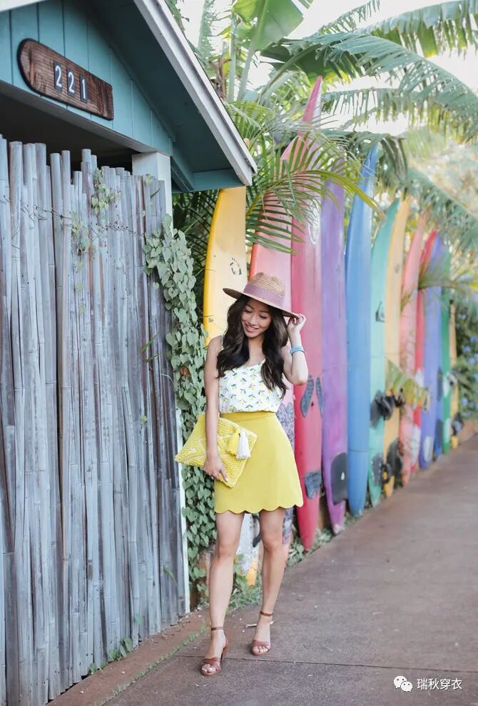 先來一條檸檬半裙。穿衣達人最常用的一招就是搭配水果圖案裏的一個主色調。好看又好搭,很實用。檸檬半裙 + 淺黃襯衣