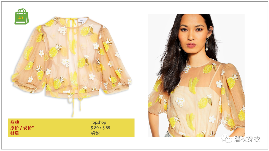 就從上麵三張圖來看,我覺得水果圖案還是麵積大些的容易穿出色。小水果,就像碎花一樣年輕女孩隨隨便便可以穿個小清新的感覺,中年阿姨穿小朵圖案,尤其是那種淺底色,排列整齊的細碎圖案一不留心就容易穿成樓下買豆漿/吃完飯在小區溜達的媽媽衫,是個要避的雷區。