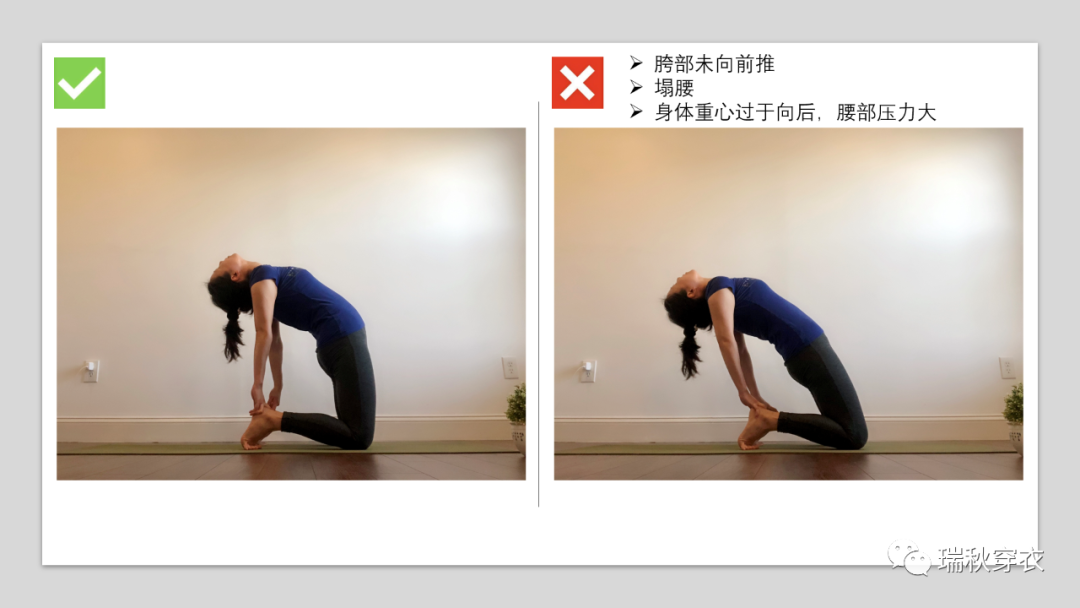 練習駱駝式的關鍵要注意骨盆向前推,把身體重心保持在身體中部,而不是向後倒以便雙手能抓住腳踝。從這點上講,駱駝式對我的啟示還有在困難的時刻,隻有鼓起勇氣全力向前才能走出困局,任何想要抓住救命稻草的念頭其實隻會讓自己在迷局中越陷越深。