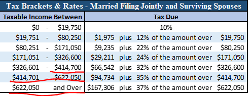 我們來對比2020年數字:2020家庭要收入達到62.2萬,才會到最高稅率37%。40萬年收入的家庭邊際稅率是32%。拜登稅改後,部分32%稅率和全部35%和37%稅率的收入會上升到39.6%稅率。