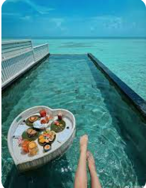 如果去馬爾代夫不要忘了去享受一下他們浪漫的水上漂流的早餐,那是在水麵上漂放的早餐大餐盤,人可以在水中行走,感受漫步水中的早餐時光,真是別具一格的創意!