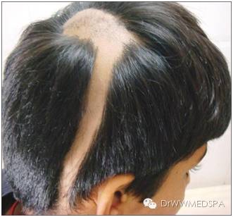 需要皮膚活檢確定診斷,常見的病因為局部環狀紅斑狼瘡,苔癬毛囊炎,嚴重的真菌感染等。疤痕脫髮的病理改變為深層真皮纖維化,毛囊破壞完全失去再生能力。因而任何局部或全身性治療都無齊於事,隻有頭皮縮減術或毛髮移植術尚能矯正該類脫髮。