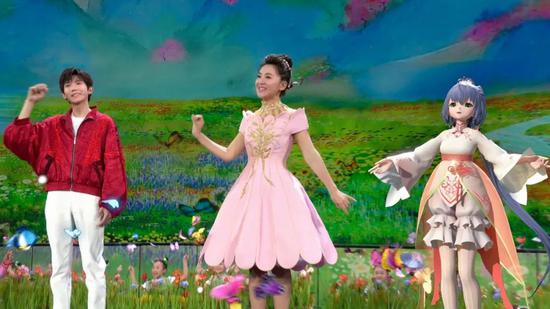 今年的春晚節目《聽我說》中,虛擬技術搭建的稻田和無際的花海構成了一個多彩而生動的豐收場景,蝴蝶縈繞、落英繽紛之中,鏡頭一轉,洛天依從蓮花中翩然降落到舞台,和童年女神月亮姐姐以及當紅偶像王源並肩歌唱。