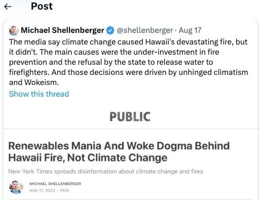 對氣候問題有多年研究關注、有近80萬推特粉絲的Michael Shellenberger先生認為,該次災難的主要原因是消防投入不足以及州政府拒絕向消防員及時放救災所需水。這些決定是由極端的氣候主義和極左鬥派(woke)造成的。