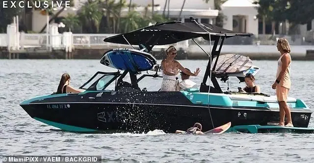 站在快艇中的伊萬卡,被輕而易舉地捕捉到了,似乎正在和浮在衝浪板上的女兒阿拉貝拉打招呼。