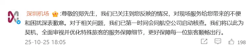 10月25日晚間,深圳機場官方微博在歌手鄭智化的評論區留言致歉:尊敬的鄭先生,我們已關注到您反映的情況,對現場服務給您帶來的不便和困擾深表歉意。對於相關問題,我們已第一時間會同航空公司啟動核查。我們將以此為契機,全麵審視並優化特殊旅客的服務保障細節,更好保障每一位旅客順暢出行。