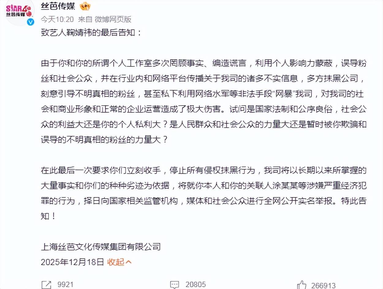 絲芭傳媒今日以"最後通牒"形式指控藝人鞠婧禕及關聯人塗某某涉嫌"嚴重經濟犯罪",宣稱將向監管部門實名舉報,將雙方持續兩年的合約糾紛推向刑事指控層麵。