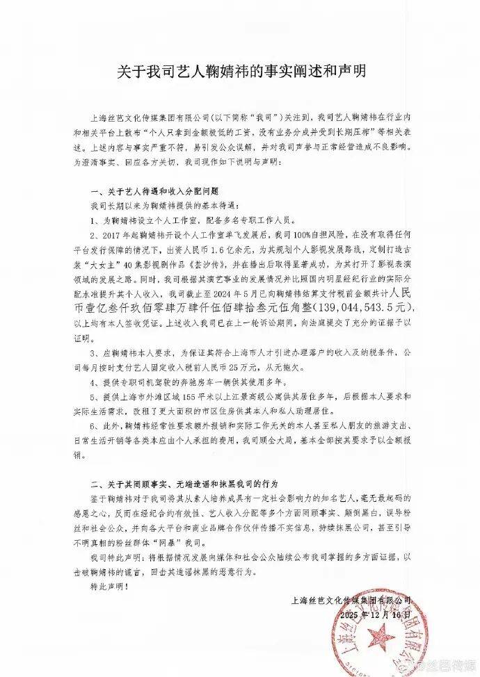 絲芭公布十年支付鞠婧禕稅前1.39億元(含《芸汐傳》1.6億投資),強調提供房車、公寓及報銷私人開銷。