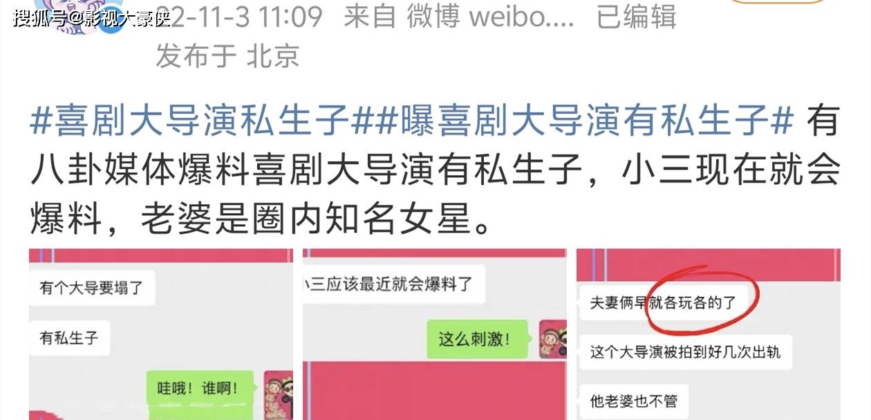 早在2022年,就有狗仔爆料說某喜劇大導演有私生子,老婆是圈內知名女星,老婆也知曉丈夫行為,這個大導演被拍到好幾次出軌了,他老婆也不管,目前小三是準備爆料出這件事情,估計是想原配離婚,自己好和大導演結婚,但最終這個人是誰,好像也沒有曝光出來。